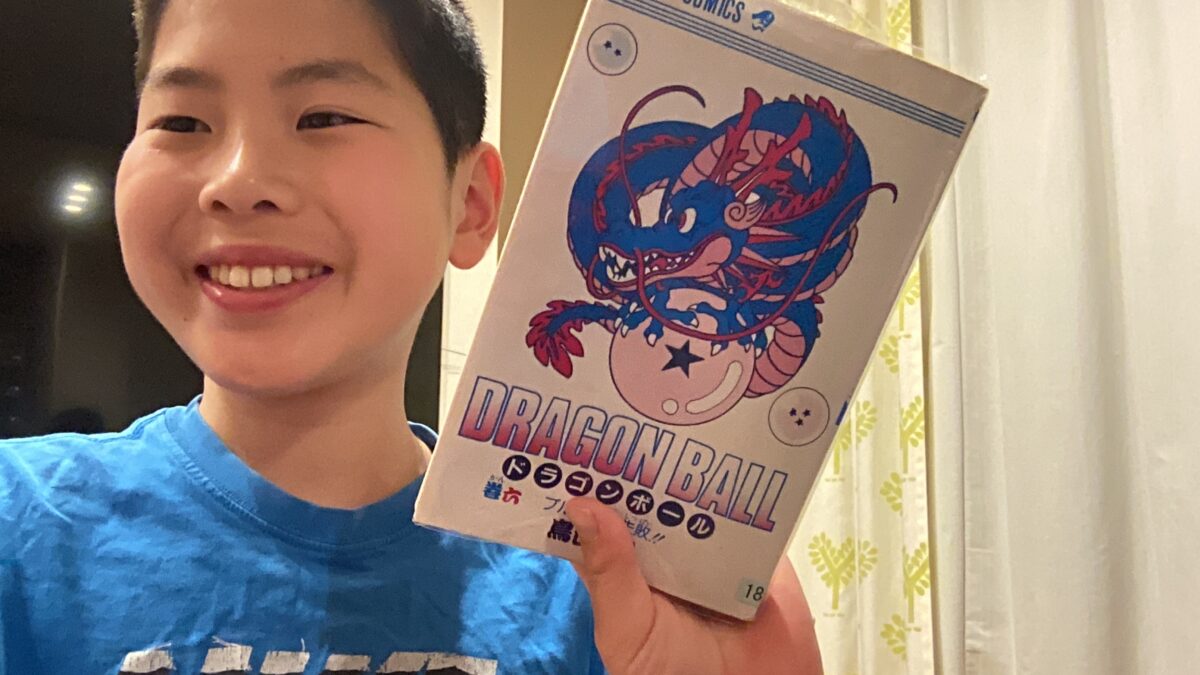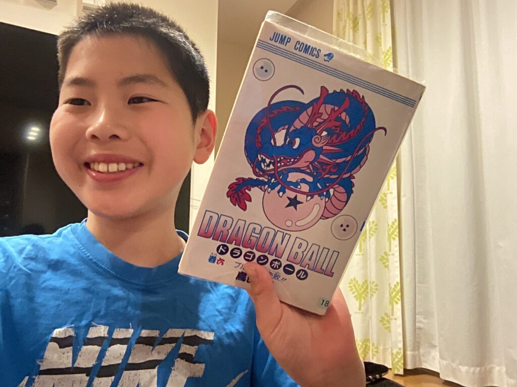 最近、僕は漫画のドラゴンボールをめっちゃ読んでいます。僕は、これまでにドラゴンボールを読んだ事がなくてパパがめっちゃ面白いき読んでみーやと言われたから読み始めました。案の定それはめちゃくちゃ面白くて、今日僕は1時間熱中して読んでいました。本当に面白いんですよ。この日記を読んでいる大半の人がドラゴンボールを読んでいると思います。I think this is the most interesting book I have ever read.僕は、今6巻目を読んでいて、パパがこれからもっと面白くなるでと言っていました。これからもっと楽しみです😊。