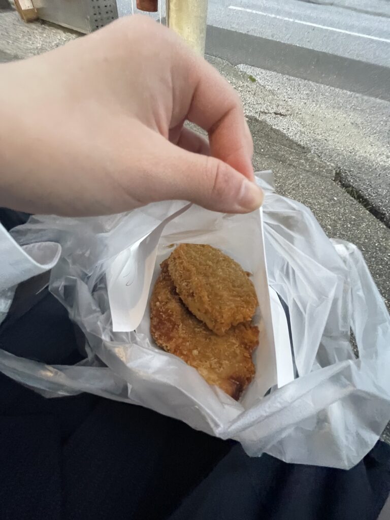 そして今日は帰りに中学校と高校が一緒の友達とお肉屋さんに行きました。今日はスポーツテストや「Gプロ」という活動があり、二人ともへとへとでお腹がぺこぺこになっていました。その状態で食べる、「豚味噌カツ」と「お肉屋さんのコロッケ」は格別でした。友達は「ハムカツ」を食べてました。その子は、小さい頃からそのお肉屋さんに通い続けているらしく、来るたんびにハムカツを頼むらしいです。私もあのお店の常連になって、お気に入りのメニューを決めたいです🍴そのお店には、外にベンチがあるのですが、そこに座って風を感じながら食べました。しかも、めちゃめちゃ大きいのに安いんです‼︎最高でした。これからも学校帰りに沢山寄りたいです🙂↕️